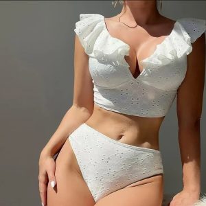2025 White Jacquard Fabric Ruffle V Neck Women′s Sexy 2 Pieces Swimsuits Bathing Suit