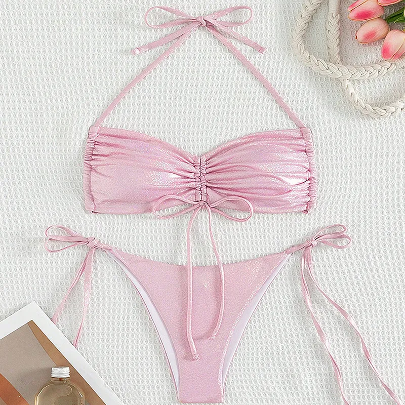 2025 New Halter Cut Out Sexy Bikini Center Drawstring Pleated Top for Young Women Two Pieces Swimsuit with Shining Fabric Cheap Swimwear Manufacturers China